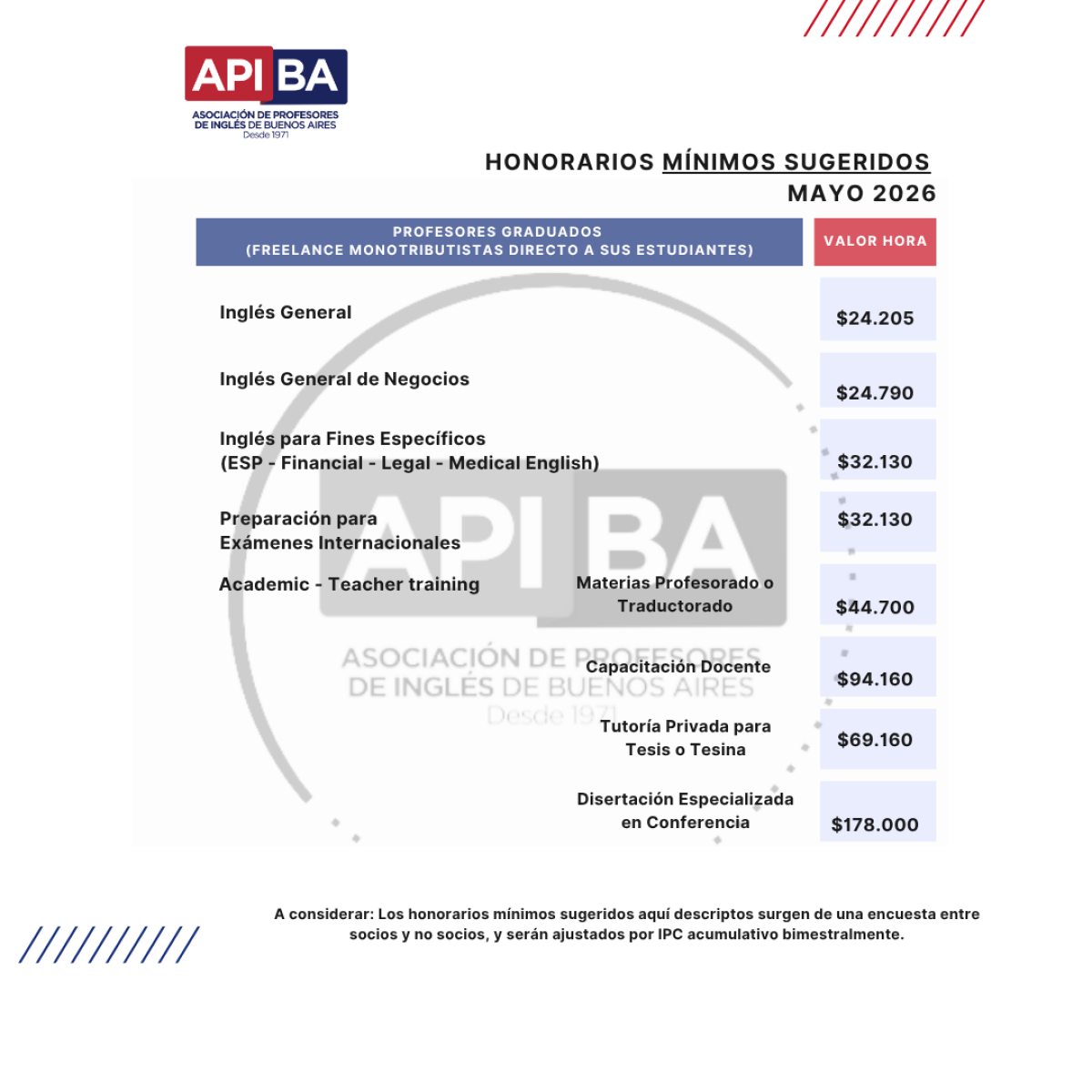 Sugerimos, además, tener en consideración diversas variables como ubicación geográfica, formación y experiencia docente, clases individuales vs. clases grupales, etc. APIBA no impone lo que sus socios (y no socios) deban cobrar, sólo se sugiere un honorario mínimo de base.